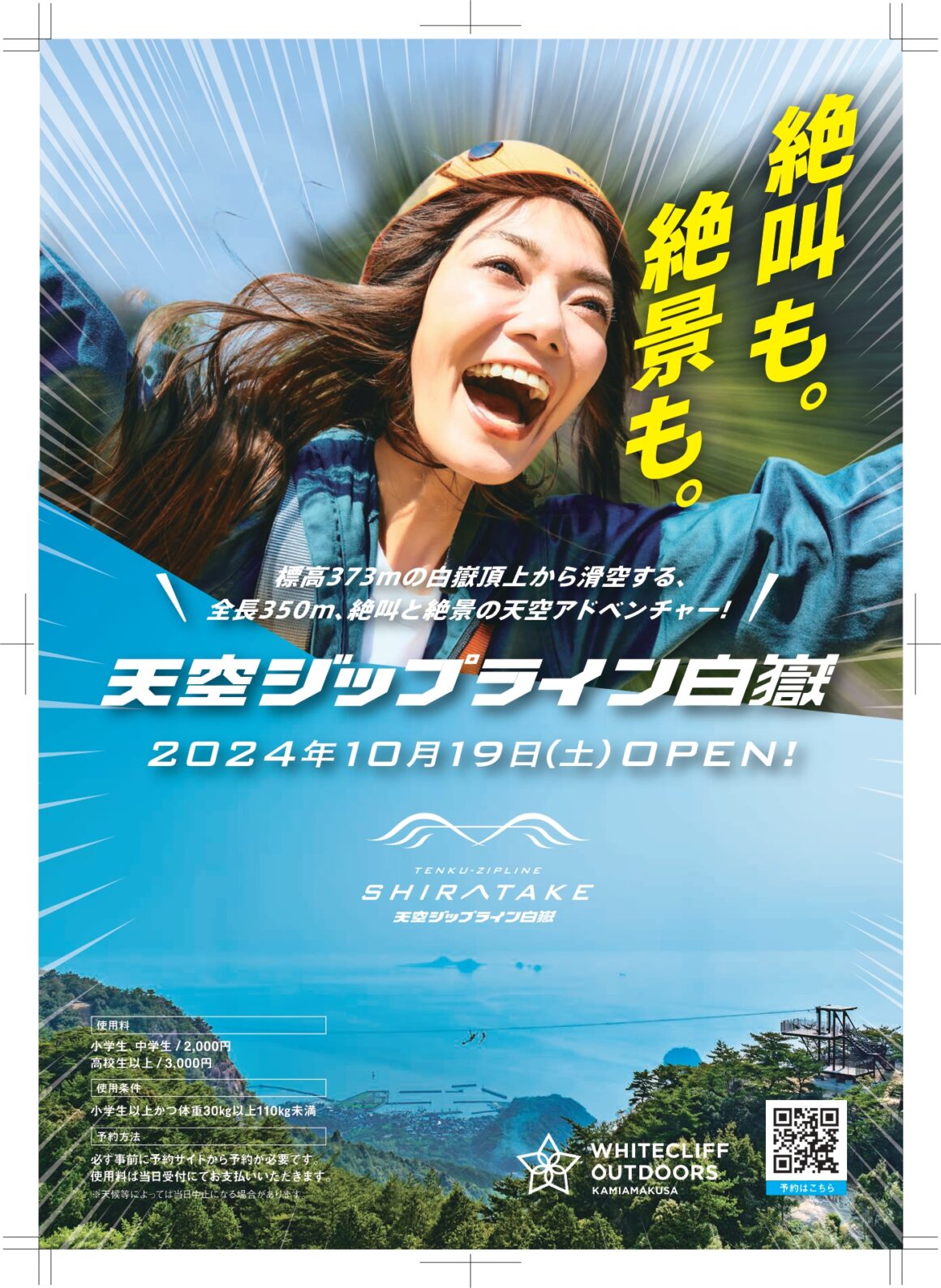 雲仙天草国立公園の中、標高373mの白嶽山頂からスタートする全長350mのジップライン。