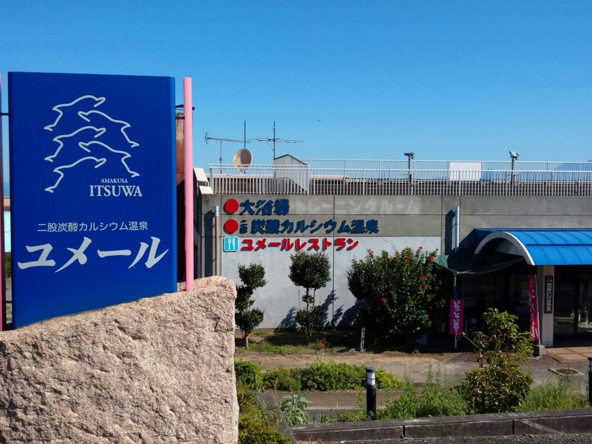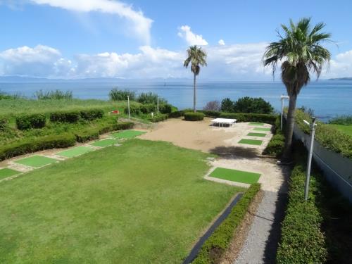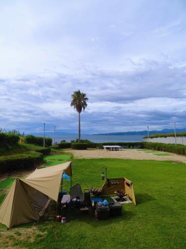 目の前に透き通る海が広がるキャンプサイト「イルカテラス」と、同じく海を望む温泉施設「ユメール」。