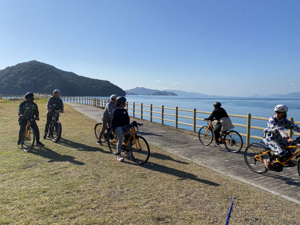 サイクリングコースのおすすめは、えびすビーチの静かな海辺の風景、そして倉岳神社へと続く山道です。
